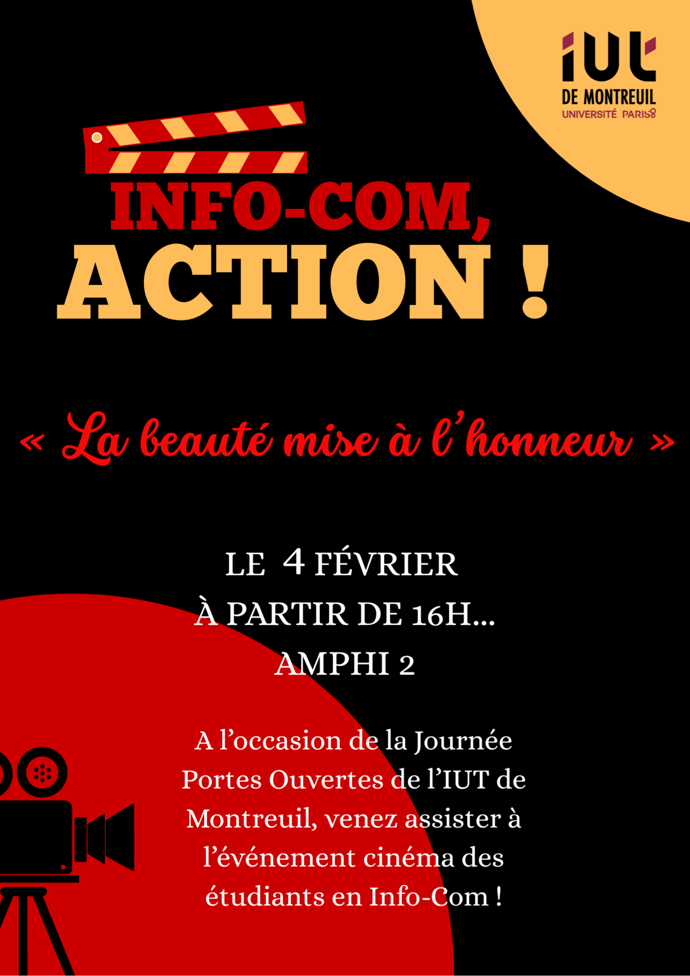 L’équipe InfoCom Action de l'IUT vous invite à assister à l'événement de diffusion de courts-métrages réalisés par les élèves de la filière InfoCom à l’occasion de la JPO le 4 février à partir de 16h! 🎥